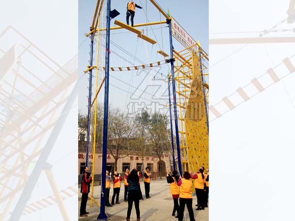 規(guī)格:占地17米×17米,由15個1米×1米×4米高的站臺組成。平臺高2米。起點和終點設(shè)有樓梯。   包含項目:獨木橋、勇往直前、圓木橋、圓木秋千、等…